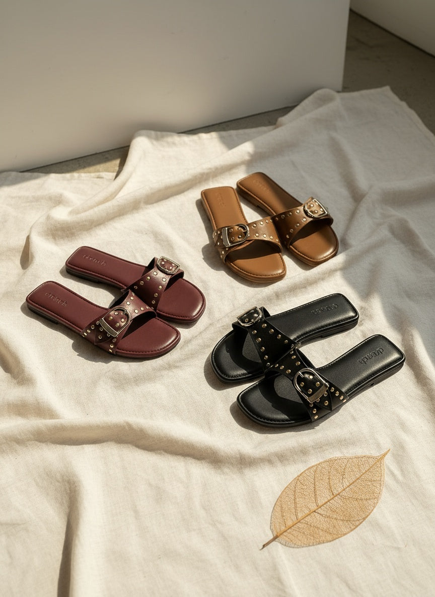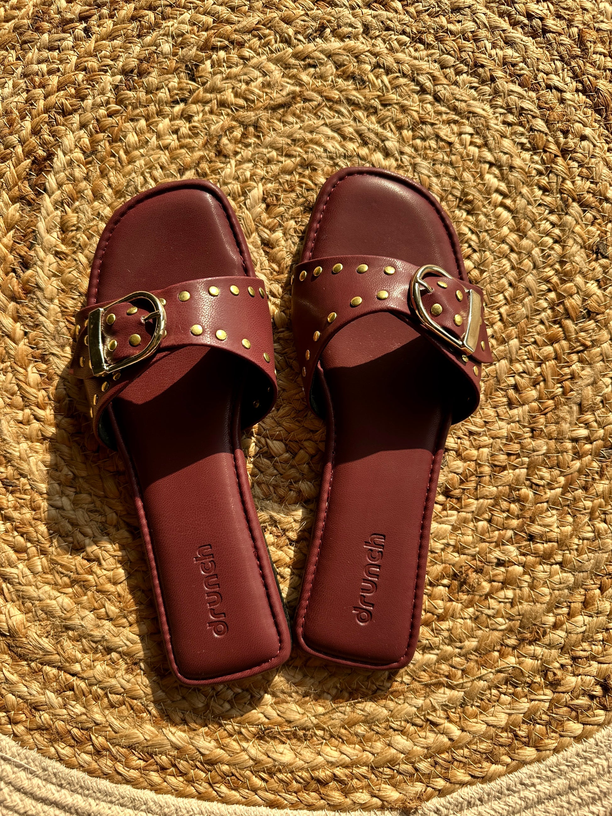 Step into everyday elegance with the Dune Flats in Burgundy. The deep, rich hue adds a sophisticated twist to a classic design, while the studded details bring a subtle statement. Whether you're pairing them with denim or a flowy dress, these sandals offer all-day comfort with a touch of personality. Included in Drunch’s basic range, these are designed to be your go-to flats for any occasion—chic, versatile, and effortlessly stylish.