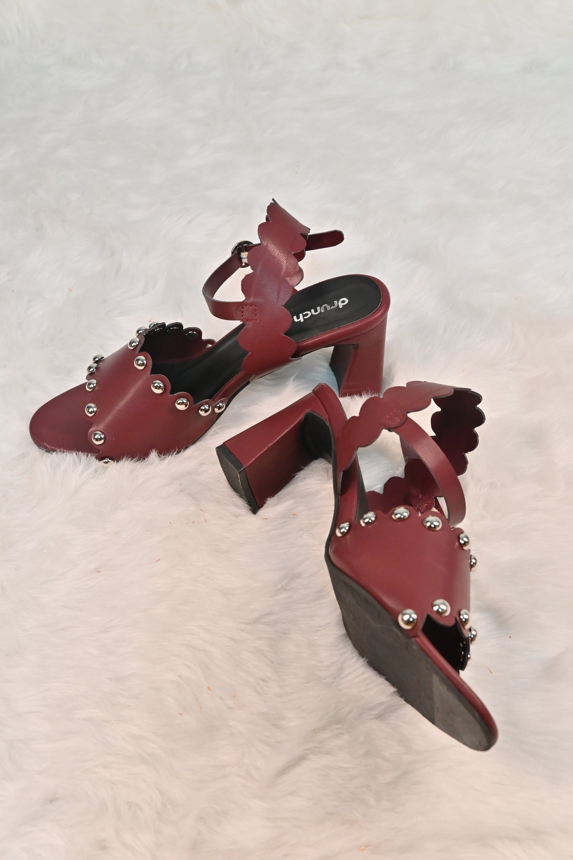 Add a touch of elegance with a bold edge in our burgundy scallop heels, designed to make a statement. Featuring delicate scalloped edges and sleek silver rivet detailing, these heels strike the perfect balance between soft femininity and modern glamour.